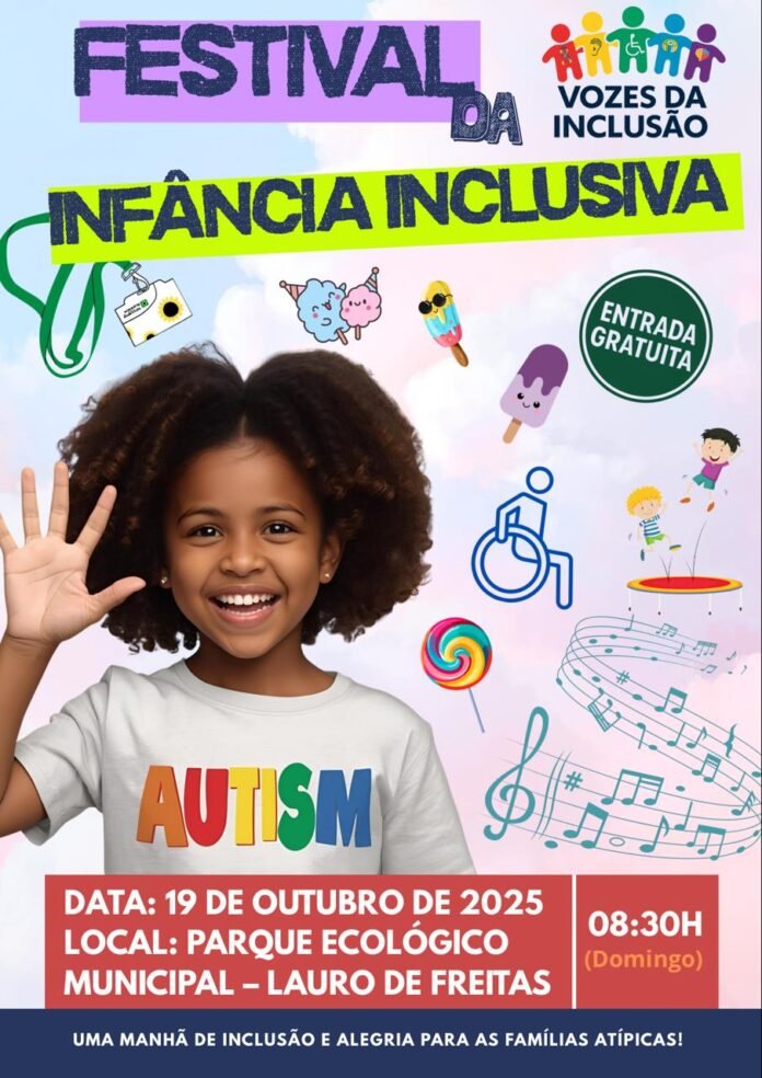 No próximo dia 19 de outubro de 2025, a partir das 8h30, o Parque Ecológico Municipal de Lauro de Freitas será palco do Festival da Infância Inclusiva Vozes da Inclusão, um evento gratuito que promete unir lazer, acolhimento e integração entre crianças típicas e atípicas, além de suas famílias.