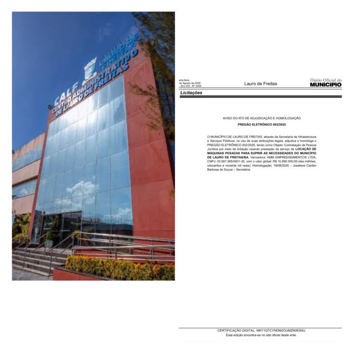 A Prefeitura de Lauro de Freitas, por meio da Secretaria de Infraestrutura e Serviços Públicos, homologou no dia 19 de agosto o resultado do Pregão Eletrônico nº 002/2025, que destinou R$ 10,8 milhões à empresa AMM Empreendimentos Ltda. para prestação de serviços de locação de máquinas pesadas.