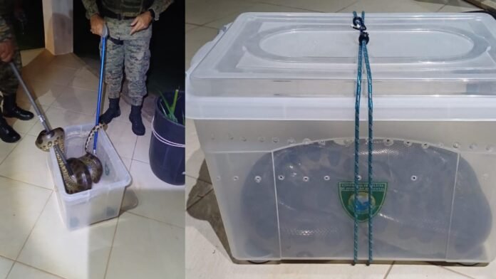 A serpente foi acondicionada em caixa apropriada para transporte, garantindo sua integridade física, e será encaminhada ao Núcleo de Triagem de Animais Silvestres do IENAM, para os cuidados necessários antes de ser devolvida ao habitat proveniente.