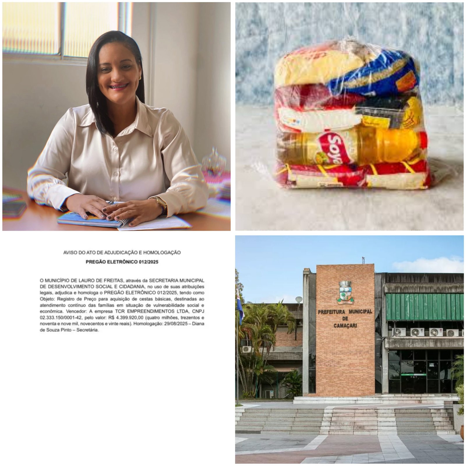 A Prefeitura de Lauro de Freitas homologou, no dia 29 de agosto de 2025, o Pregão Eletrônico nº 012/2025, destinando R$ 4.399.920,00 à compra de cestas básicas. A empresa vencedora foi a TCR Empreendimentos LTDA, inscrita no CNPJ 02.333.150/0001-42, sediada em Camaçari-BA. A assinatura foi feita pela secretária de Desenvolvimento Social e Cidadania, Diana de Souza Pinto.