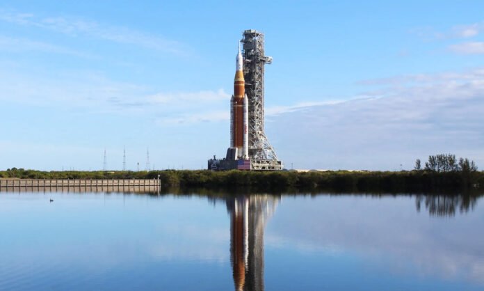 Foguete SLS, da NASA, que vai lançar a missão Artemis 2 à Lua, posicionado na plataforma de lançamento. Crédito: NASA